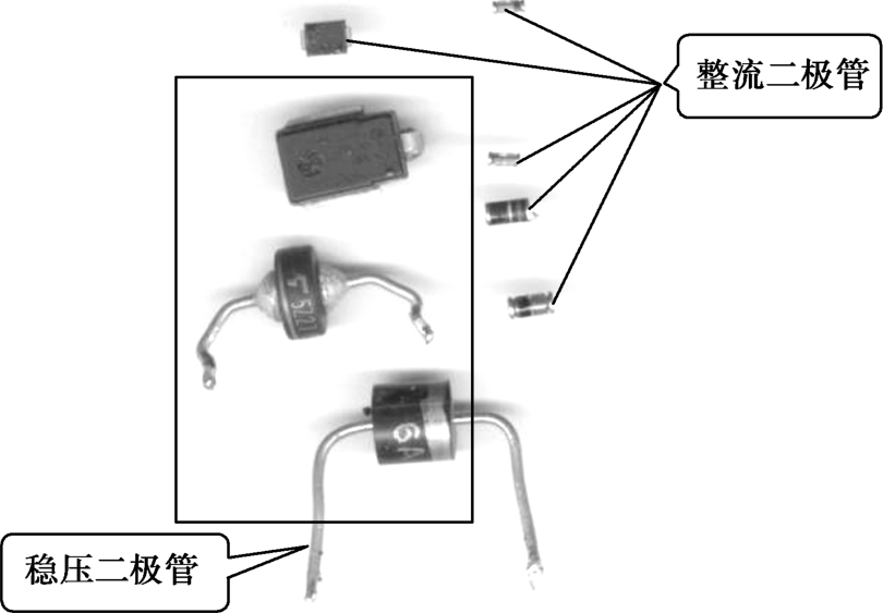 二极管外形如图1-3所示。二极管的管芯是一个PN结,由P区接出的引线为二极管的正极,由N区接出的引线为二极管的负极,用管壳封装后就制成二极管。二极管具有单向导电性,是电子制作中经常使用的一种半导体器件。