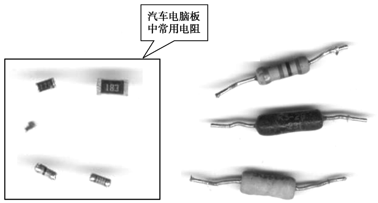 通常汽车电脑板中最常用电阻如图1-1所示。其表示阻值的方法是数码标志法,即用三位数字标示阻值。在三位数码中,从左至右第一位、第二位数字表示电阻值的第一、二位有效数字,第三位数则表示有效数字后有几个“0”,单位为Ω。例如,标示为“183”的电阻器其阻值则是18 000Ω,而标示为“120”的电阻器的阻值则是12Ω。