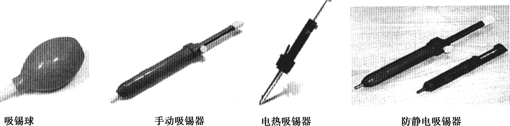 常见的吸锡器主要有吸锡球、手动吸锡器、电热吸锡器、防静电吸锡器以及双用吸锡电烙铁等,如图1-15所示。