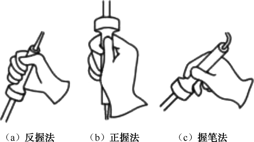 为了使被焊件焊接牢靠,又不烫伤被焊件周围的元器件及导线,就要根据电烙铁的大小和被焊件的位置及大小,适当地选择电烙铁的握法。电烙铁可分为反握法、正握法与握笔法三种,如图1-14所示。