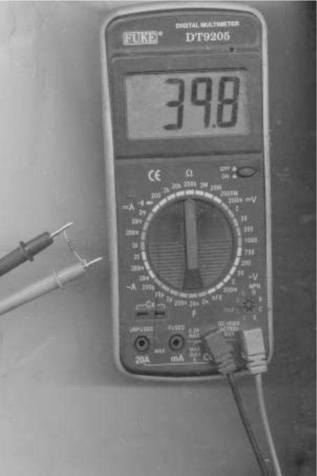 ②直流电压的测量:将万用表的一个转换开关置于交、直流电压挡,另一个转换开关置于直流电压的合适量程上,且“+”表笔(红表笔)接到高电位处,“-”表笔(黑表笔)接到低电位处,即让电流从“+”表笔流入,从“-”表笔流出。若表笔接反,表头指针会反方向偏转,容易撞弯指针。