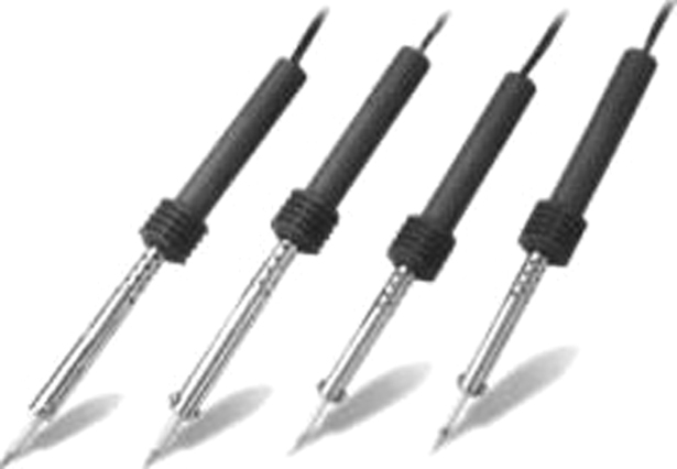 常用电烙铁如图1-13所示。电烙铁在使用前要进行质量与安全检查,具体方法是:用万用表R×1k 挡,分别测量插头两根引线之间的电阻和插头与电烙铁头之间的绝缘电阻。插头与电烙铁头之间的绝缘电阻应该为无穷大,如果测量有电阻,说明这一电烙铁存在漏电故障。