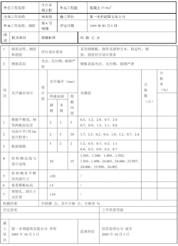 3.统计《混凝土模板工序质量评定表》中各“项次”实测值合格点数,计算各项次实测值合格率,写出评定表中“检测结果”栏内相应数据。