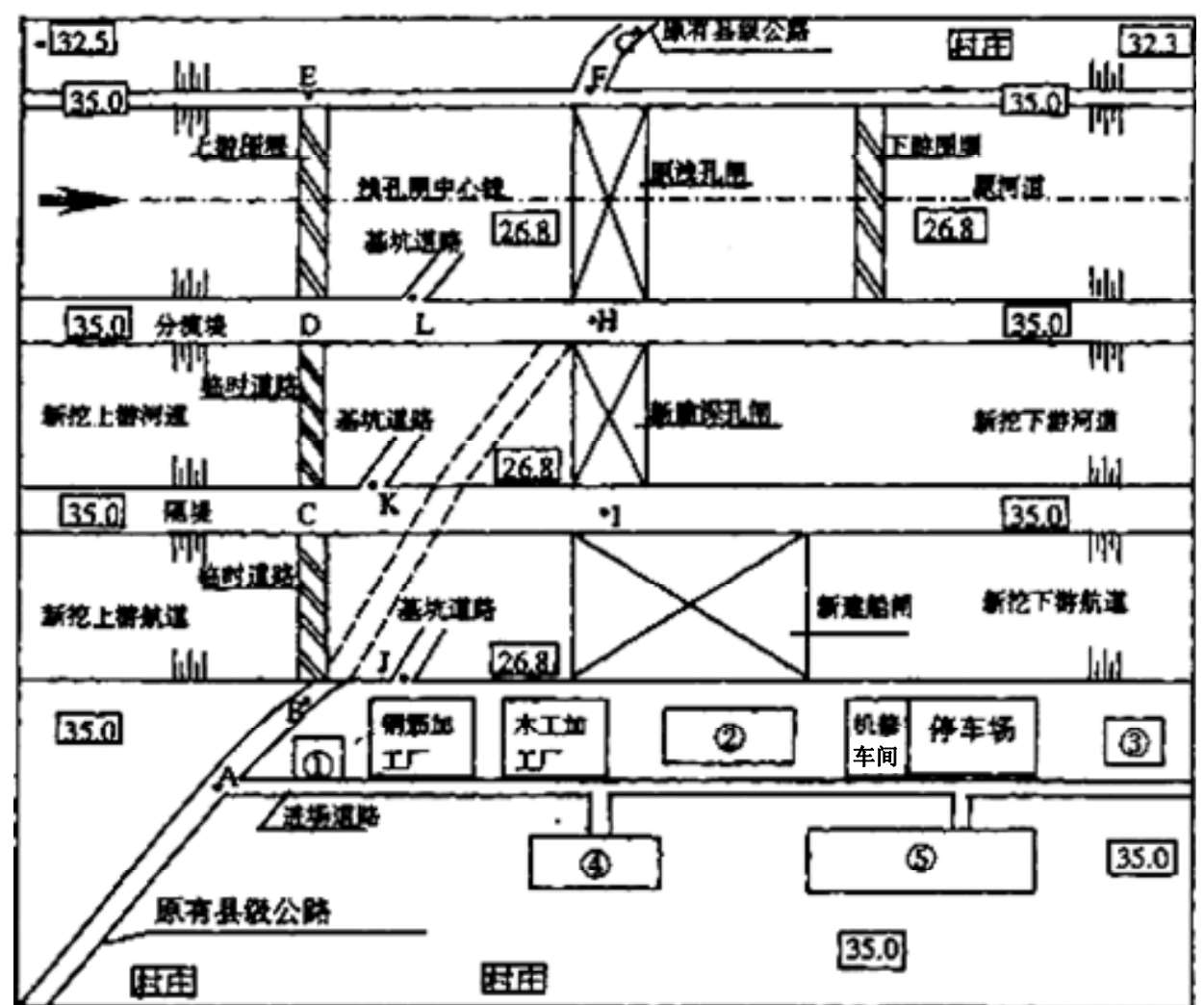 【答案】 新建深孔闸(完工前)、浅孔闸加固(施工期)、新建船闸(2005年8月)这3个施工阶段两岸的交通路线如下。