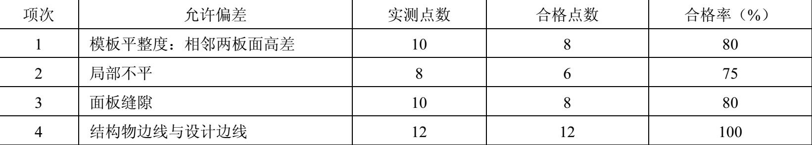 3.统计《混凝土模板工序质量评定表》中各“项次”实测值合格点数,计算各项次实测值合格率,写出评定表中“检测结果”栏内相应数据。