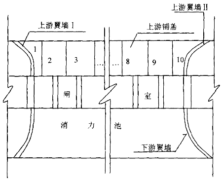 某水闸工程建于土基上,共10孔,每孔净宽10m;上游钢筋混凝土铺盖顺水流方向长15m,垂直水流方向共分成10块,铺盖部位的两侧翼墙亦为钢筋混凝土结构,挡土高度为12m,其平面布置示意图如下。