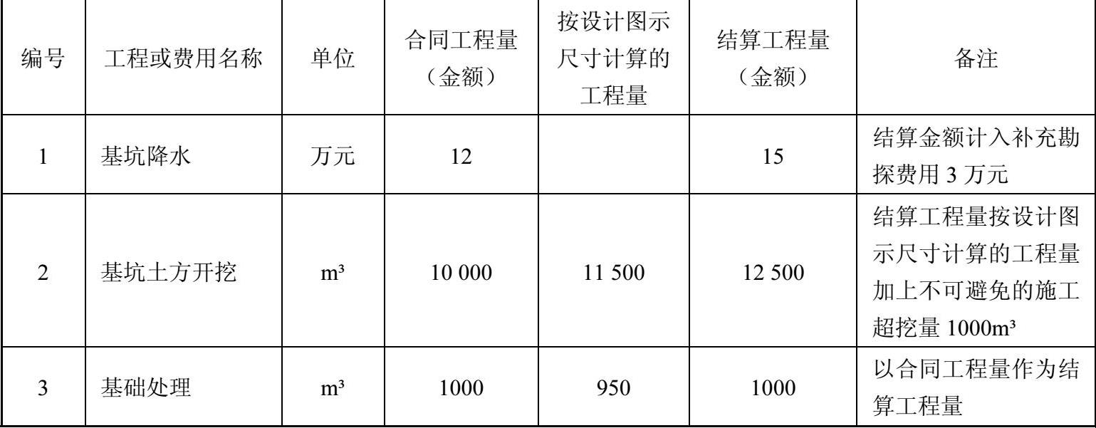 事件3:按照施工进度计划,施工期第1月承包人应当完成基坑降水、基坑开挖(部分)和基础处理(部分)的任务,除基坑降水是承包人应完成的临时工程总价承包项目外,其余均是单价承包项目。为了确定基坑降水方案,承包人对基坑降水区域进行补充勘探,发生费用3万元。施工期第1月末承包人申报的结算工程量清单如下表所示。
