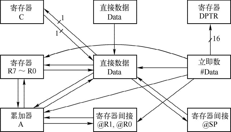 ⑥立即数、立即地址和累加器(ACC)作为数据源地址,是“O型供血者”,他们有最多的接收数据的目的地。而外部数据存储器(XDATA)最“内向”,它只与ACC互传数据。