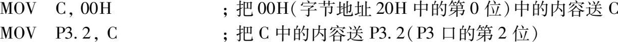 ①位传送指令MOV C,bit和MOV bit,C没有在表 3-4中列出。这两条指令是把一位数据在C(进位位、位于程序状态寄存器PSW的第 7位,作为布尔操作的累加器)中与直接位地址(即所有位可寻址的存储器中的位)之间进行操作的。如
