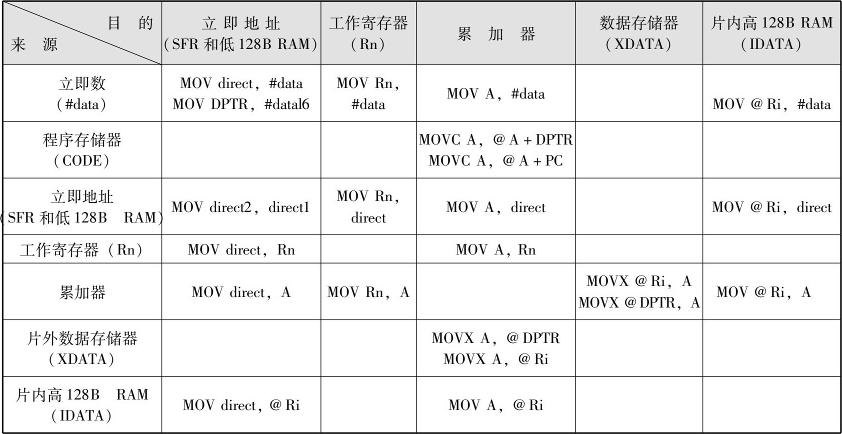 数据传送指令是单片机编程中使用最多的指令。前面介绍了P89V51的存储器分布,自然地就应该有这些存储器(区)之间的数据传送指令,但是,由于P89V51的存储器区之间地址有重叠,因而必须用不同的寻址方式和操作数来区别所传送数据的“来源”和“目的”。这部分内容对初学者来说是最难记忆的。为了方便读者快速、准确地掌握P89V51的数据传送指令,一方面详细说明传送指令与数据的“来源”和“目的”之间的关系,如图 3-5所示且参见表 3-4;另一方面,将在 3.3节详细说明数据传送指令,3.4节给出若干数据传送实验,务必请读者按照示例和本章的习题要求尽量多做实验。