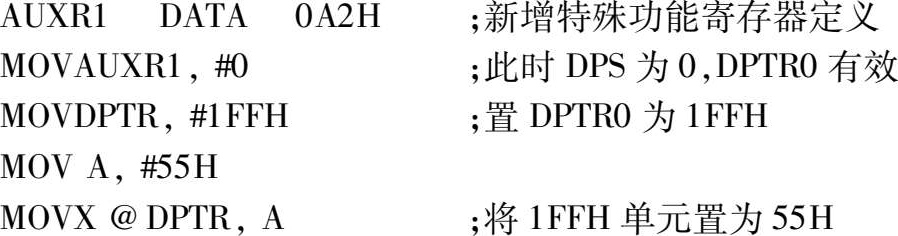 DPS:DPTR寄存器选择位。DPS=0,选择DPTR0;DPS=1,选择DPTR。下面是一段通过AUXR1选择DPTR的例程。
