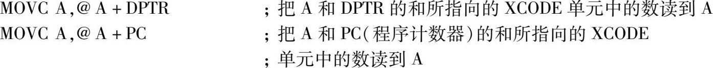 注意:指令中采用“MOVC”作为助记符,说明是从程序存储器(CODE)中读取数据。而从XDATA中读取数据的指令为: