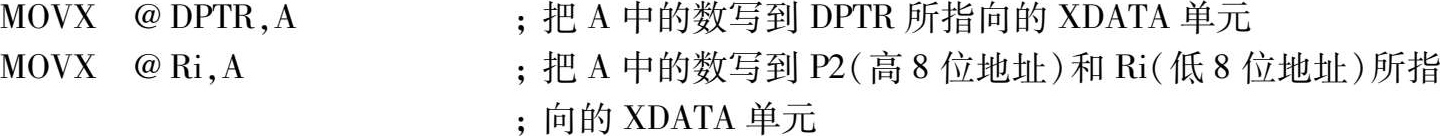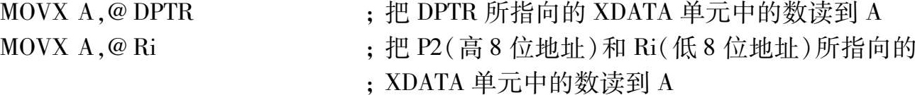 指令中采用“MOVX”作为助记符,说明是从外部数据存储器(XDATA)中读取数据的。同样,写到XDATA的指令为