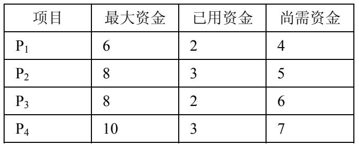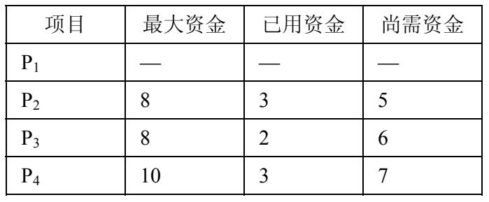 若某企业拥有的总资金数为 15,投资 4 个项目P 1 、P 2 、P 3 、P 4 ,各项目需要的最大资金数分别是 6、8、8、10,企业资金情况如图 2-4 所示。P l 新申请 2 个资金,P 2 新申请 1 个资金,若企业资金管理处为项目P 1 和P 2 分配新申请的资金,则P 1 、P 2 、P 3 、P 4 尚需的资金数分别为 (5) ;假设P 1 已经还清所有投资款,企业资金使用情况如图 2-5 所示,那么企业的可用资金数为 (6) 。若在如图 2-5 所示的情况下,企业资金管理处为P 2 、P 3 、P 4 各分配资金数 2、2、3,则分配后P 2 、P 3 、P 4 已用资金数分别为 (7) 。