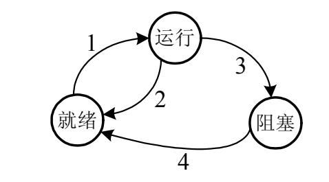某系统的进程状态转换如图 2-2 所示,图中 1、2、3 和 4 分别表示引起状态转换的不同原因,原因 4 表示 (1) ;一个进程状态转换会引起另一个进程状态转换的是 (2) 。