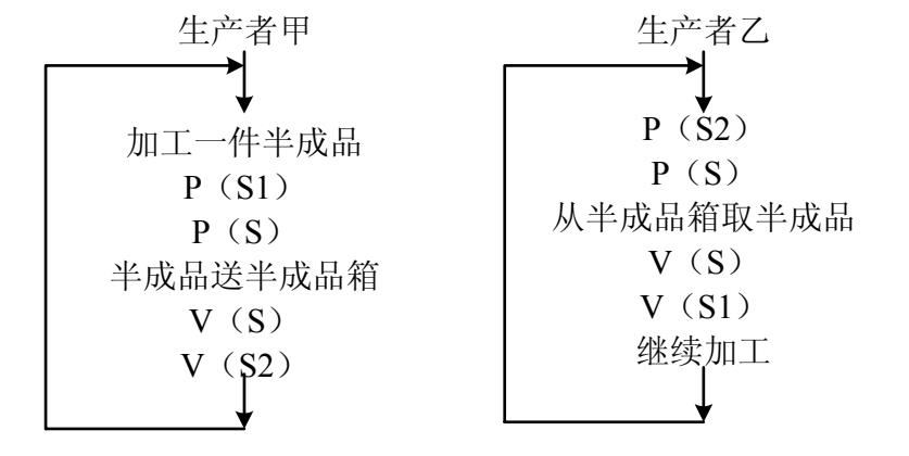 某企业生产流水线M共有两位生产者,生产者甲不断地将其工序上加工的半成品放入半成品箱,生产者乙从半成品箱取出继续加工。假设半成品箱可存放 n 件半成品,采用PV操作实现生产者甲和生产者乙的同步可以设置 3 个信号量S、Sl和S2,其同步模型如图 2-6所示。