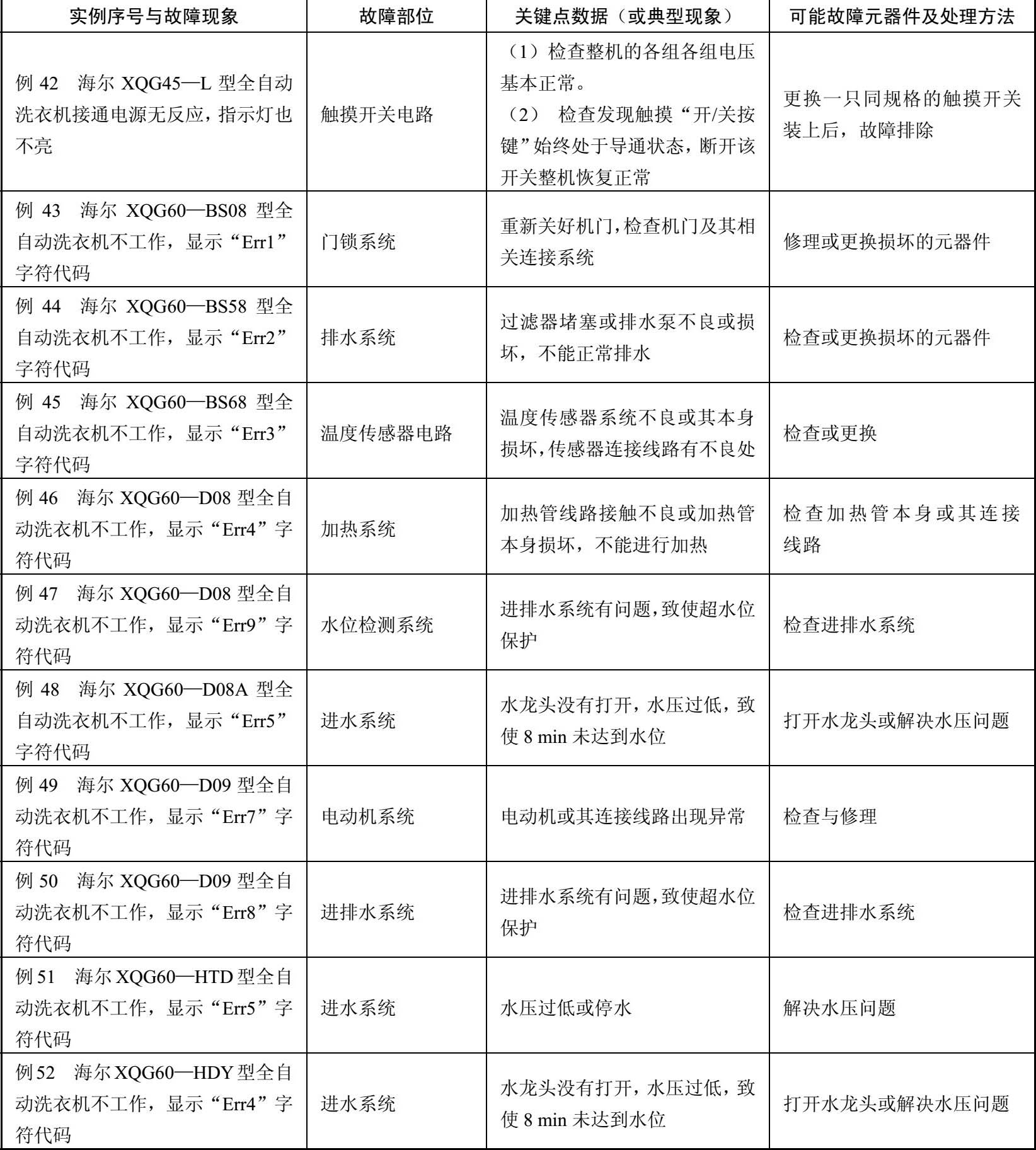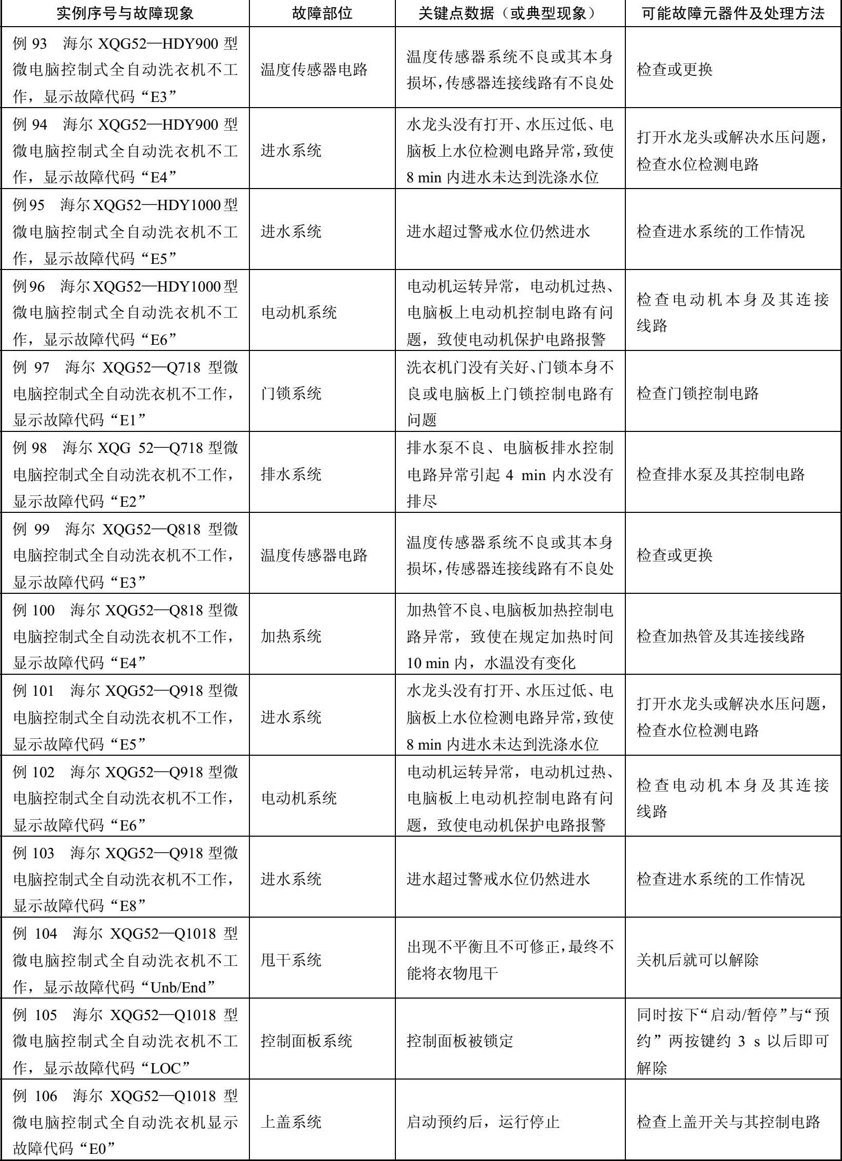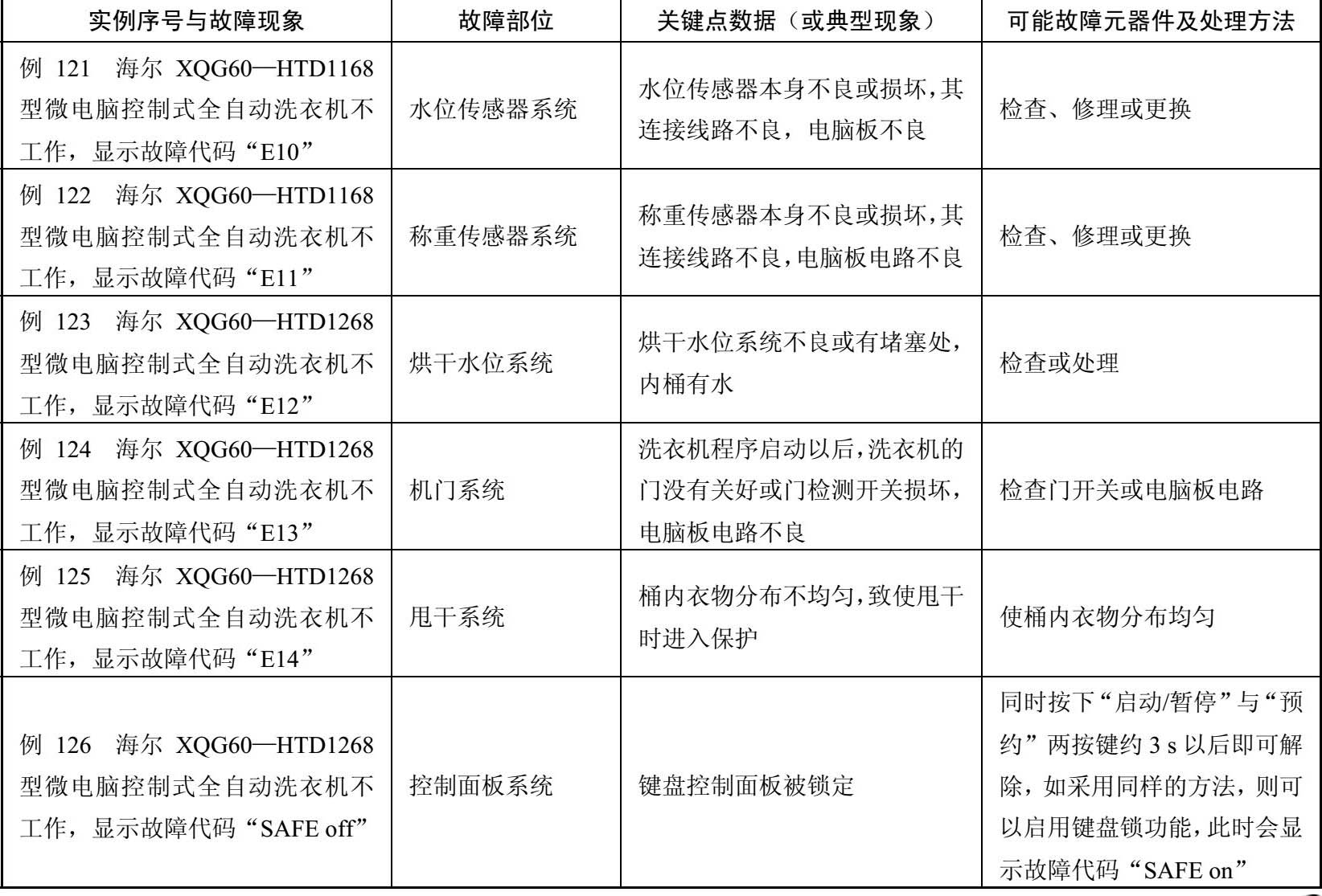 表2-4 海尔XQG45—L/XQG60—BS08/XQG60—BS58等型全自动洗衣机故障检修例42~例126