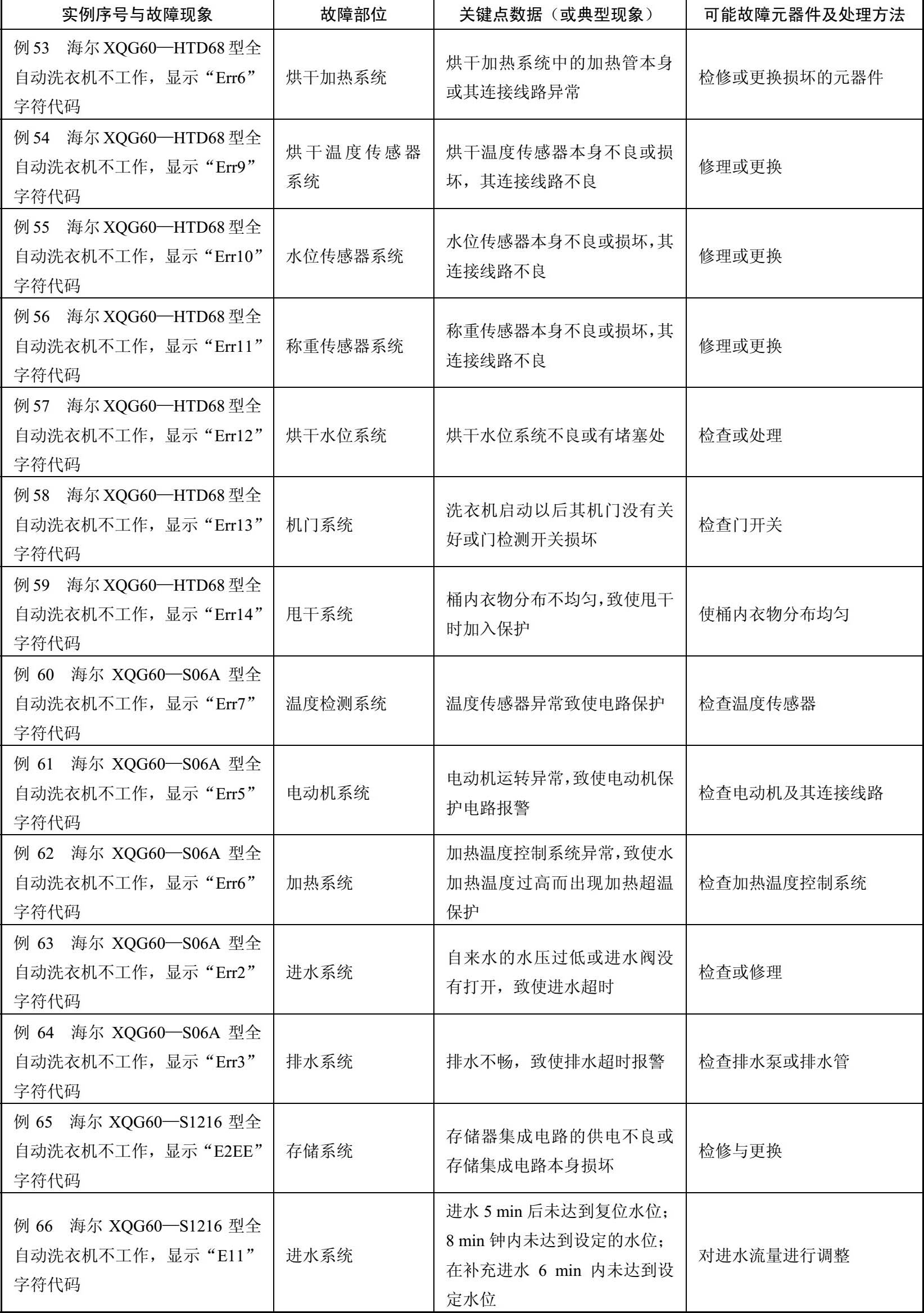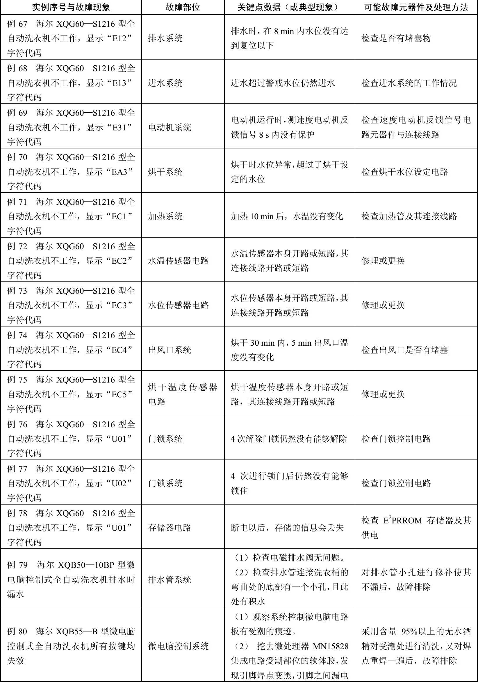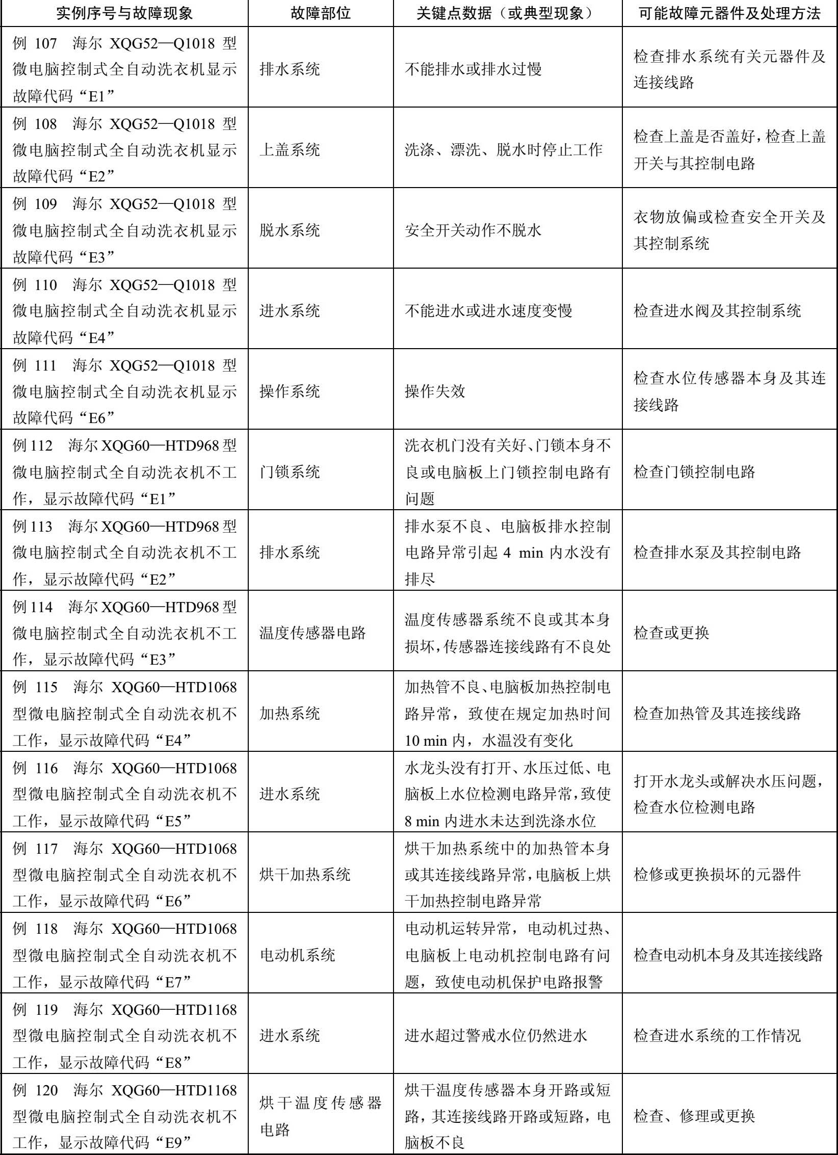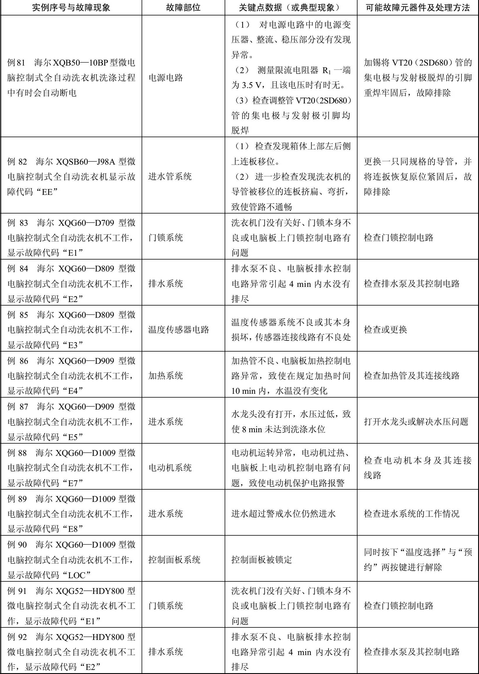 表2-4 海尔XQG45—L/XQG60—BS08/XQG60—BS58等型全自动洗衣机故障检修例42~例126