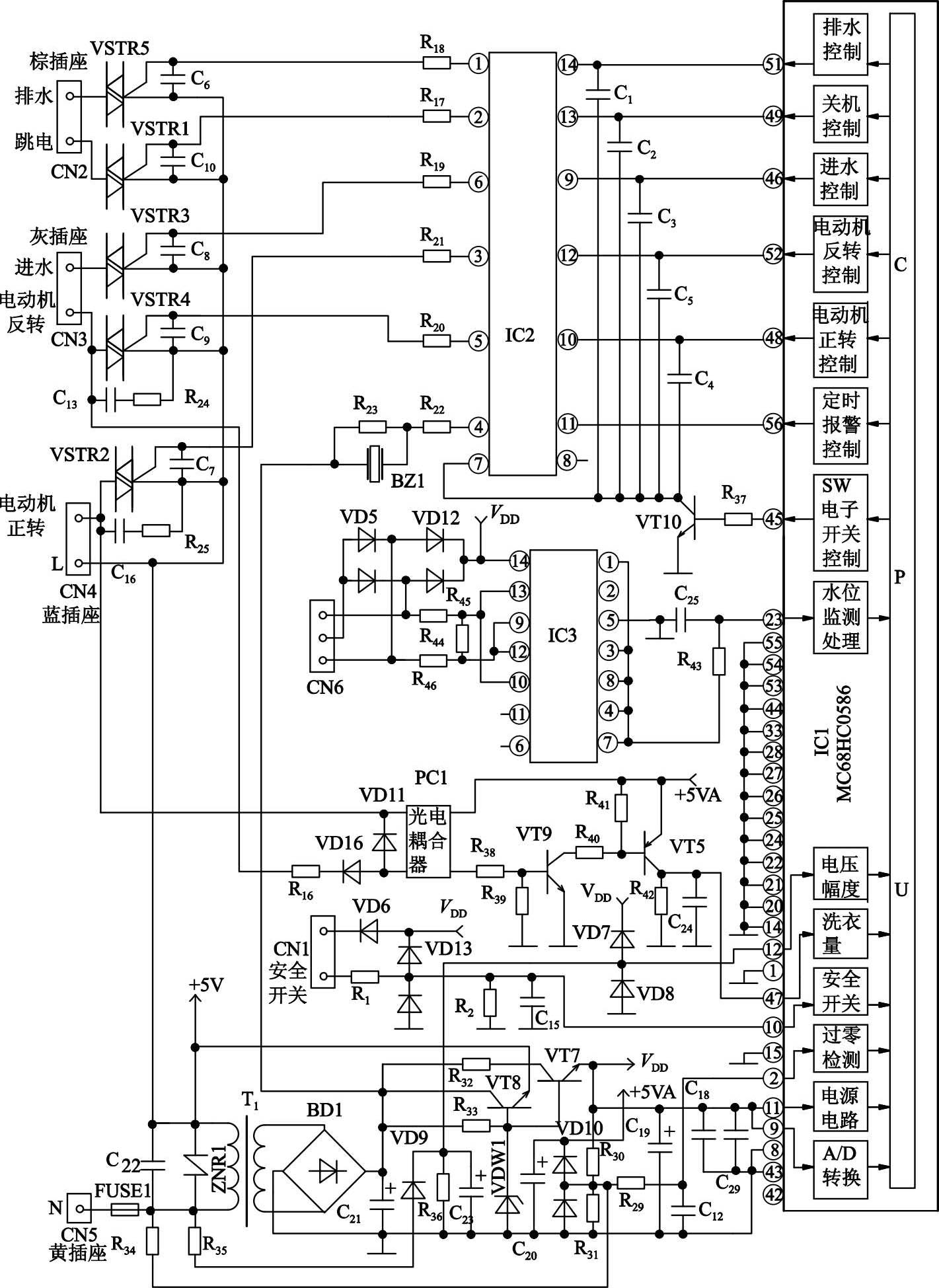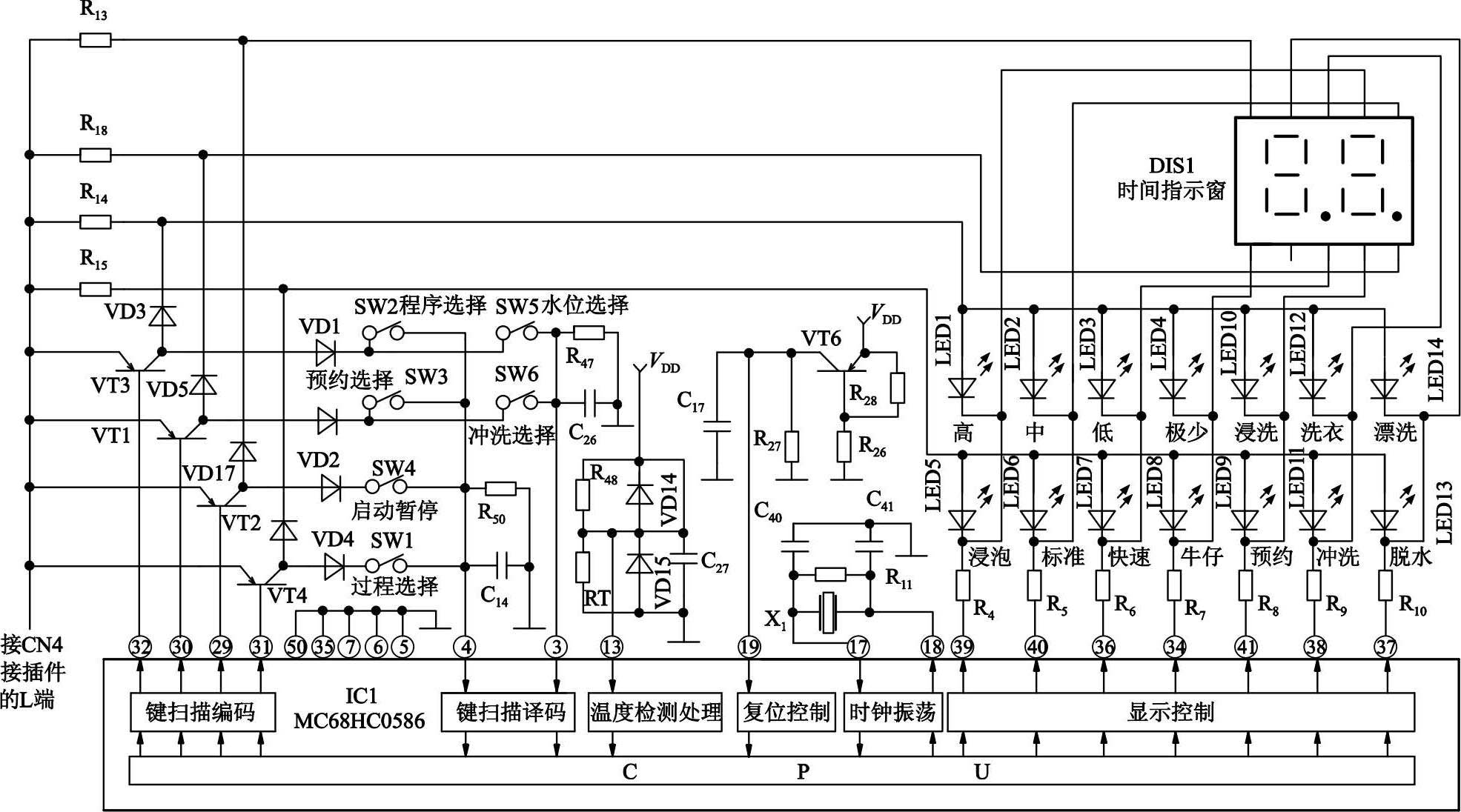 小天鹅XQB40—868FG型全自动洗衣机微电脑控制系统主要由MC68HC0586(IC1)微处理单片机为核心构成。该集成电路采用