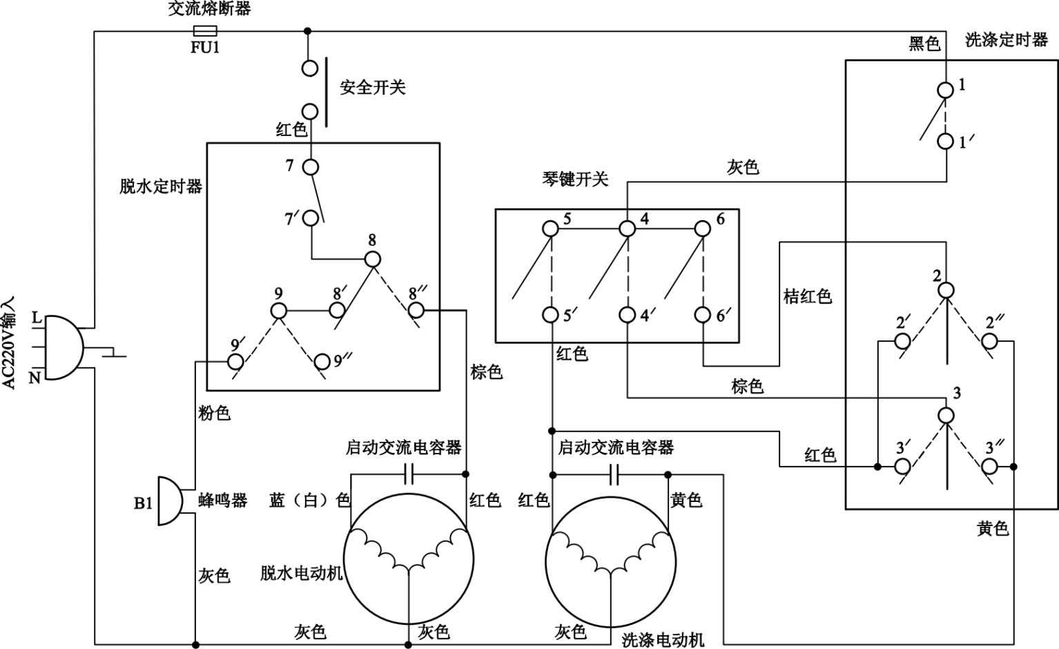 普通双桶洗衣机大都由洗涤电动机、脱水电动机、洗涤定时器、脱水定时器、按键开关、安全开关、蜂鸣器、熔断器等组成。