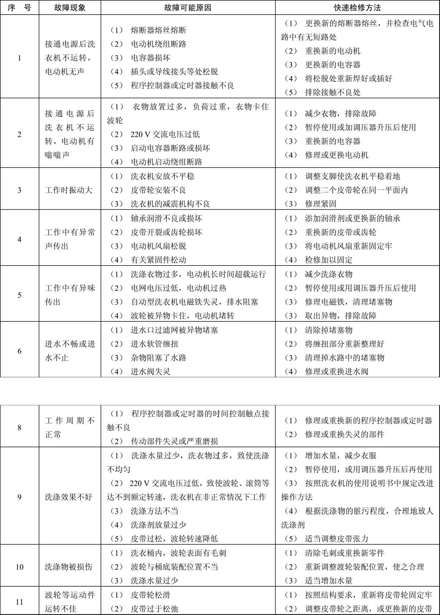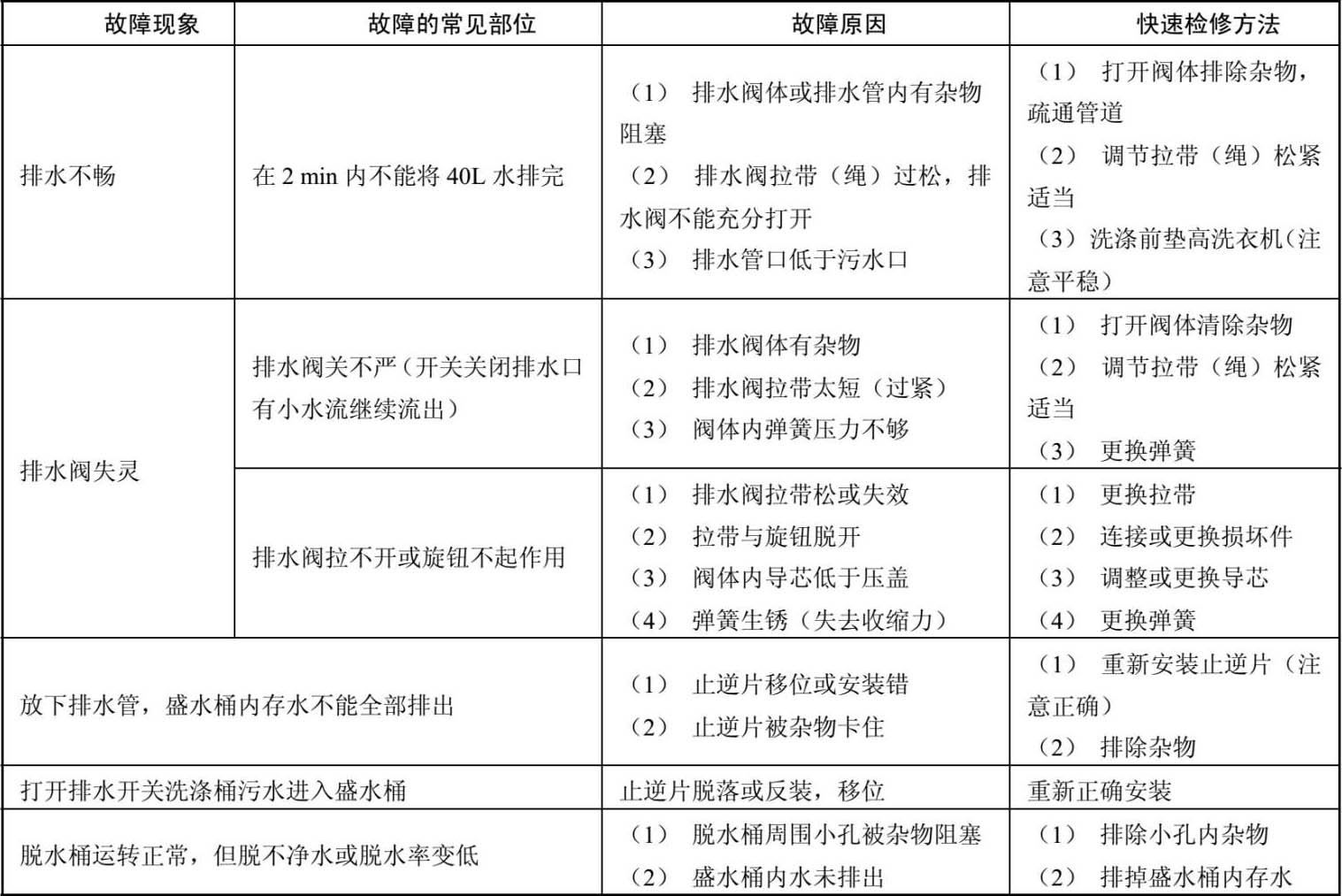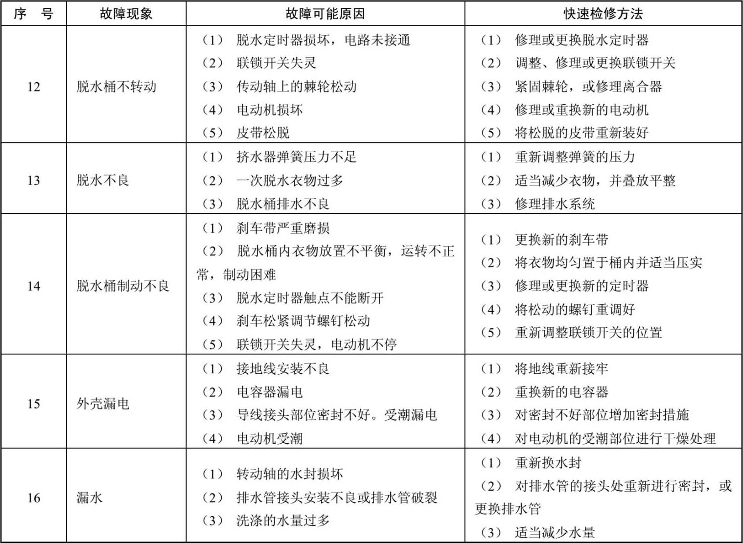 双桶洗衣机常见故障速查与检修如表1-4所列,波轮式双桶洗衣机渗漏水、排水方面故障速查与检修如表1-5所列,供快速检修故障时参考。