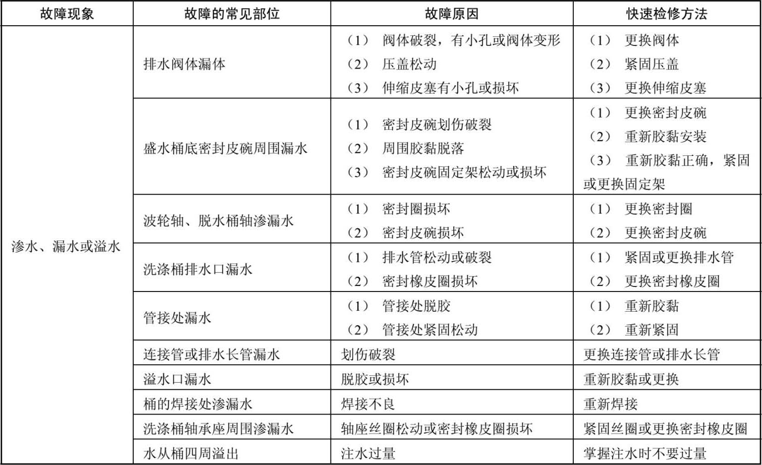 表1-5 波轮式双桶洗衣机渗漏水和排水方面故障速查与检修