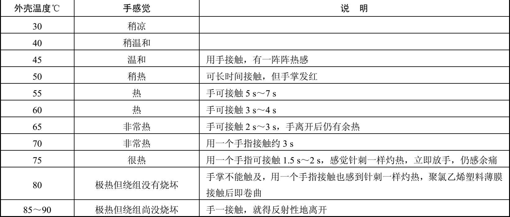 运转中电动机温度略有升高是正常现象,国家标准规定洗衣机电动机绕组温升不应大于75℃。在工厂中可以用仪器测量,在维修条件不满足的条件下,可用手感估计温度,具体方法可参考表1-6所列。