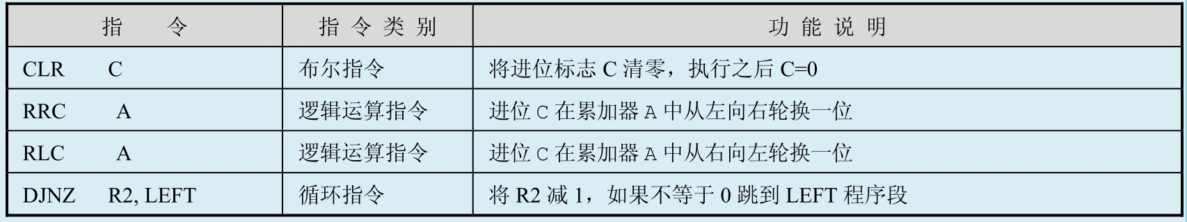 由于要执行8次“RRC A”或“RLC A”,还需要一个指令进行计数,这条指令是“DJNZ Rn,rel”,它的功能是将Rn减1,如果Rn≠0,则跳到rel处。
