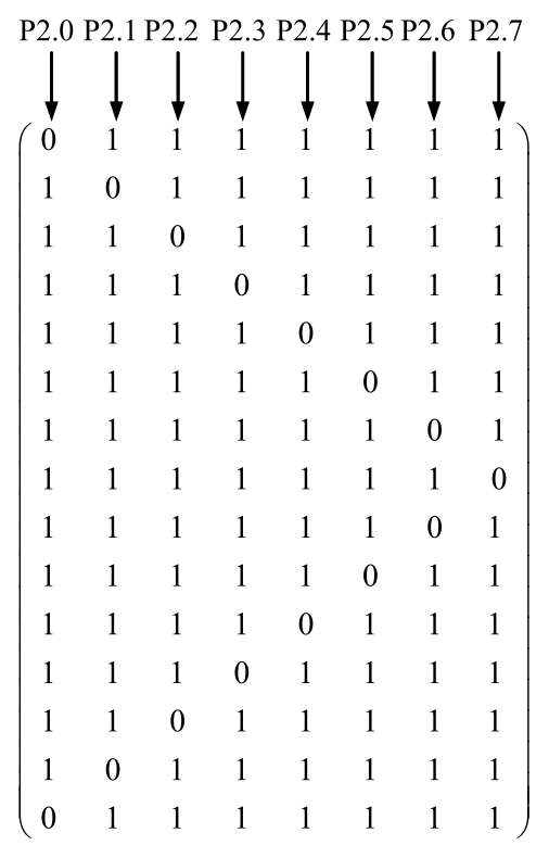 我们发现,图4-54(b)、(c)中所示的累加器A的数值与图4-52矩阵中的前两行是一致的,只要再通过一个指令“MOV P2,A”,就可实现累加器A的数据从P2口输出,从而控制对应的发光二极管发光。