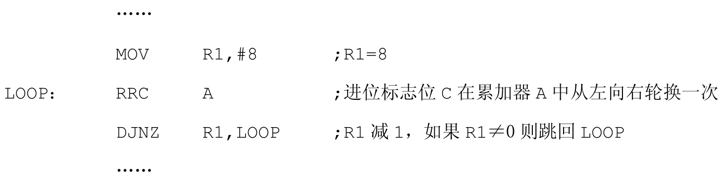 首先,“MOV R1,#8”指令把立即数8载入工作寄存器R1,此时R1=8。第2行“LOOP”是一个标号,“RRC A”让进位标志位C在累加器A中从左向右轮换一次。第3行“DJNZ R1,LOOP”将R1减1,看R1是不是等于0,如果不等于,则跳到“LOOP”标号处循环执行。