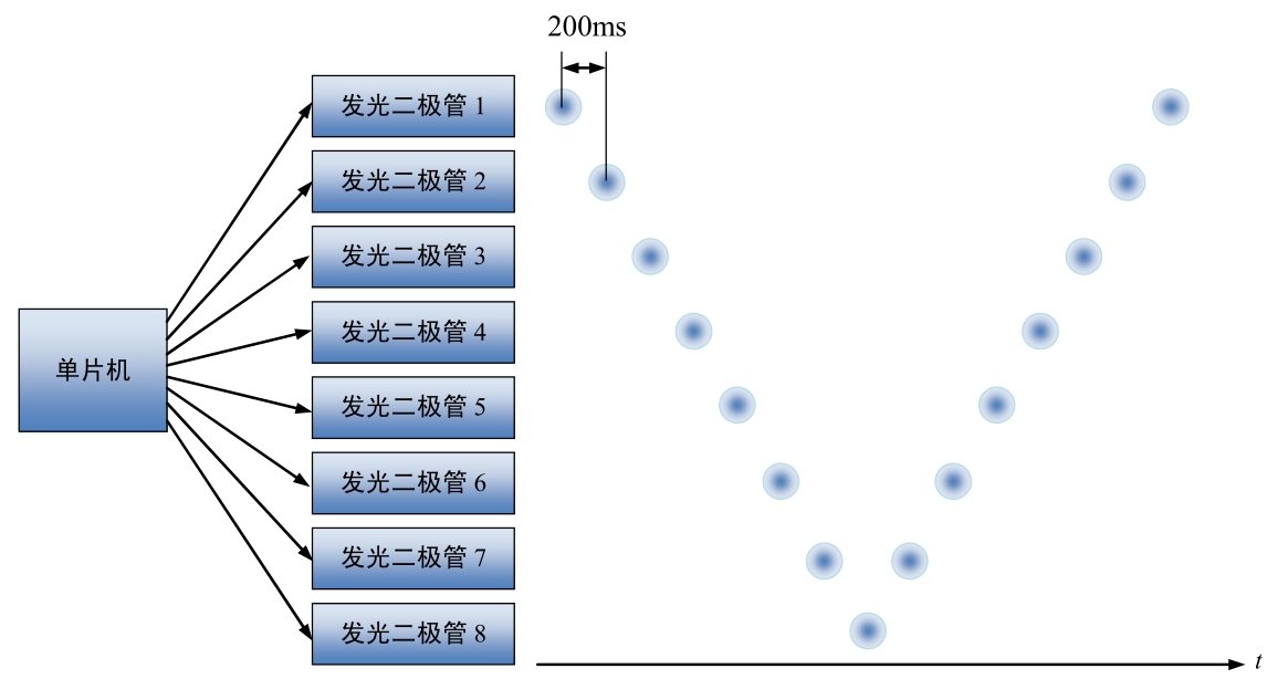 流水灯系统的功能设计为:单片机控制着8支发光二极管,每一时刻只有一支发光二极管点亮,如图4-50所示,延时200ms后熄灭而与之相邻的发光二极管点亮。直到点亮最后一个发光二极管后又以相反的方向依次点亮发光二极管。从视觉上有一支发光二极管向左右两边跑来跑去,颇有流水的效果。