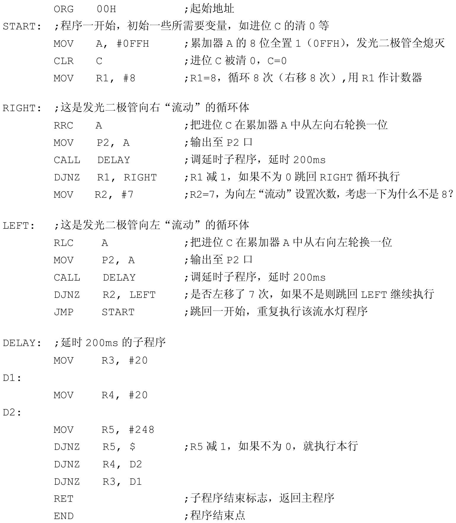 有以上的基础再来看流水灯程序就容易得多了。程序4-2中加入了丰富的注释。我们只需要一边读这个程序,一边在纸上写下各个变量(A、C、P2、R1、R2、R3、R4、R5等)的值,加上前面的分析就可以很容易理解程序的思路了。