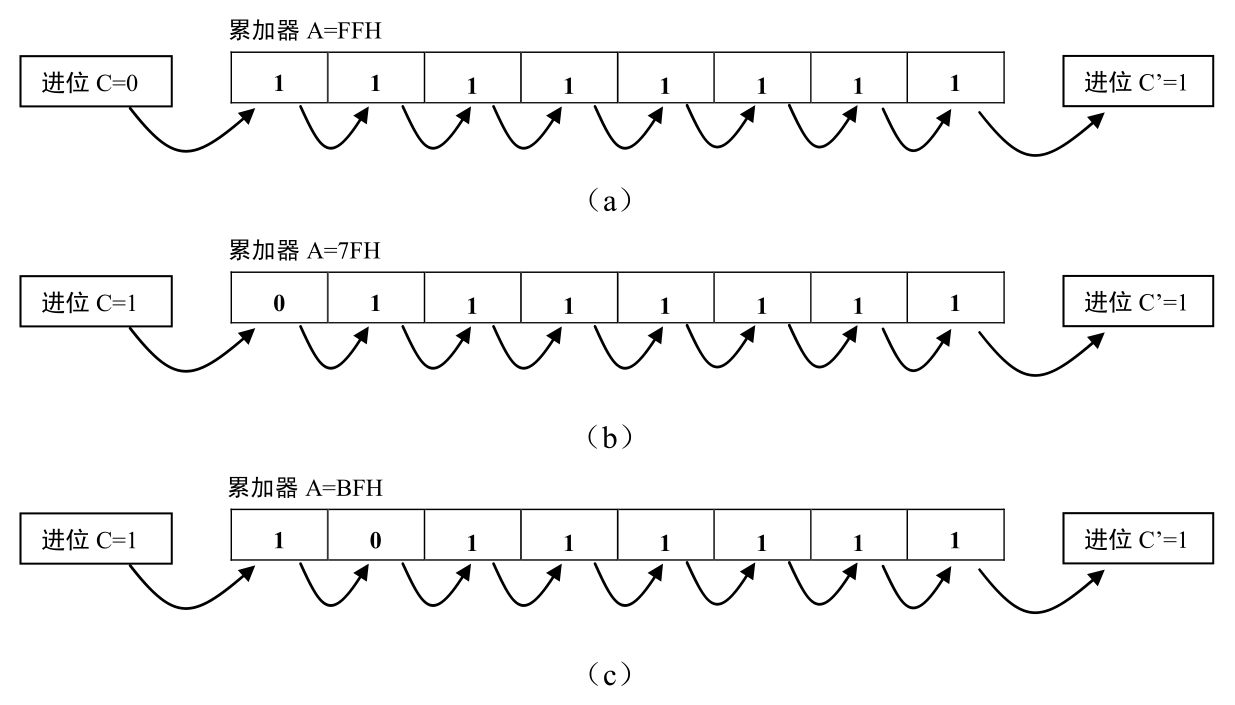 在执行指令“RRC A”以前(图4-54(a)),累加器A=0FFH,执行之后(图4-54(b)),累加器A=7FH。如果再执行一次“RRC A”,则累加器A=0BFH(图4-54(c))。每执行一次指令,0就在累加器A中向右“挤”一位。
