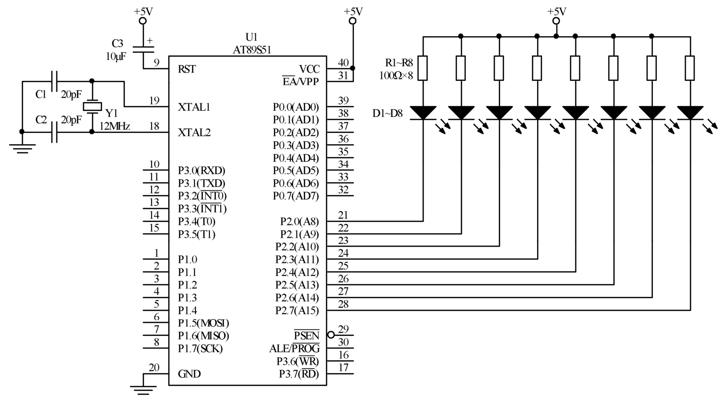 从单片机最简系统出发,给I/O口添加8支发光二极管,得系统电路如图4-51所示。当然,除了使用P2口外还可以使用P0、P1、P3完成这个实例。这里省略了下载接口部分,可以参考图4-49来连接,本书实例的电路图都没有画出下载接口部分,但我们在实际制作中都要加上,以实现与下载线的连接。