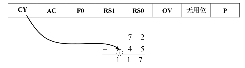 单片机在执行加法(或减法)运算过程中如果有进位(或借位)则PSW中的进位标志位C被硬件自动置1,如果没有进位(或借位)则为0。这个标志位就好像我们小学时用笔计算加法(或减法)时,在等号线上标记的进位(借位)一样,如图4-53所示。