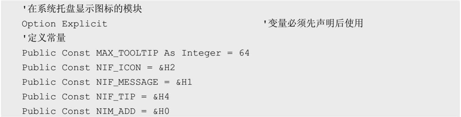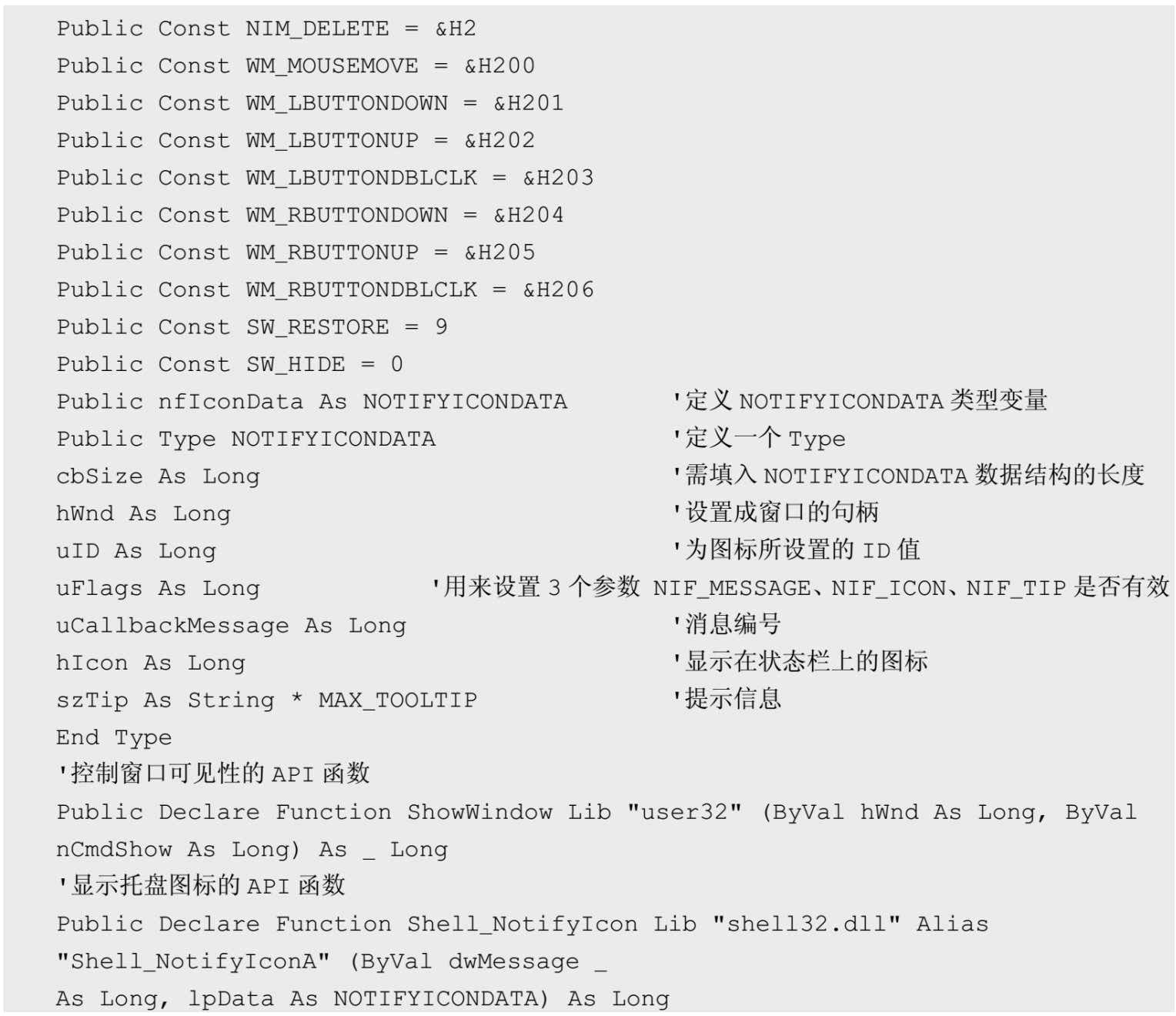 在本软件中,可以通过单击主窗体的最小化按钮将主窗体隐藏并将图标添加到托盘中,这里将系统托盘模块中用到的常量、变量和API函数声明在公共模块中,关键代码如下: