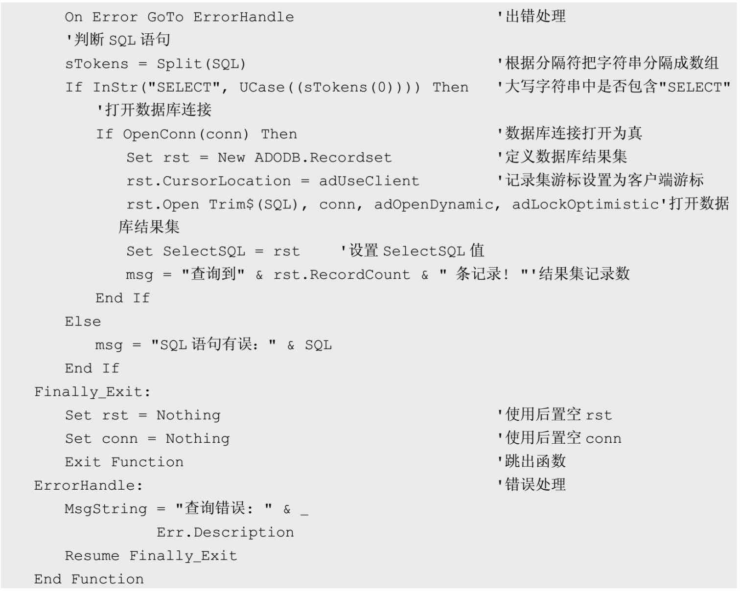 返回一个数据库结果集是在开发数据库管理系统中经常使用到的。在本程序中为了优化数据库结果集,减少代码的使用,可以在公共模块中定义一个用于执行数据库连接的函数和一个用于返回数据库结果集的函数。在编程过程中,如果需要使用数据库结果集操作,就可以直接调用数据库结果集函数SelectSQL ()来操作数据库。关键代码如下: