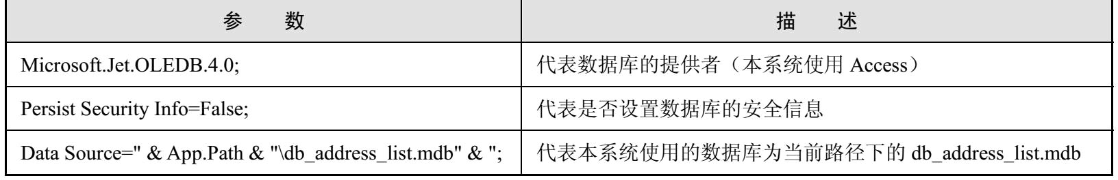 在Function OpenConn()函数中,OpenConn对应的连接字符串参数说明如表4.3所示。