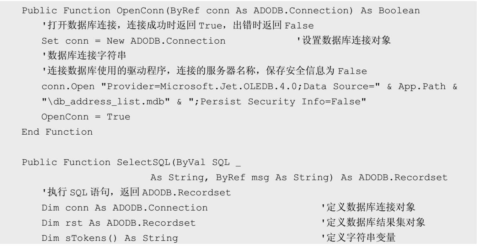 在开发应用程序时,应当将那些可能被重复使用的功能编写成通用的过程或函数存放在标准模块(也就是公共模块)中,这样可以提高代码的重用性,而且方便日后维护。本系统创建了一个名为Module1的标准模块,在该模块中定义了公共的变量、过程和函数。下面对该模块中的内容进行介绍。
