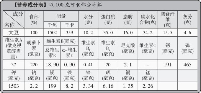 在大豆的家族中,黄豆的营养价值最高,它所含有的钙质比青大豆多50%,比黑大豆多45%;它所含有的磷,比青大豆多50%,比黑大豆多27%:它所含的铁比青大豆多l倍;它所含的维生素B 1 、维生素D 2 也都比青大豆和黑大豆要高。只有烟酸、蛋白质和热量稍比其他大豆低一些。