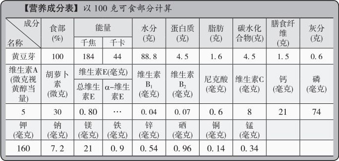 黄豆生成豆芽后,维生素A的含量比黄豆增加3倍,维生素B 1 增加2~4倍,尼克酸增加2倍多,维生素B 2 增加 2~4倍,维生素B 12 增加 10倍,维生素C从无到有,维生素E增加2倍多,叶酸成倍增加,吡多醇也有所增加,简直发生了奇迹般的变化。出现这些变化的原因是,豆类种子蛋白质含量虽高,但由于胰蛋白抑制素的存在,使它的营养价值受到了限制,而在生长豆芽的过程中,这些有害物质大部分被去除了。绿豆芽的变化也很大。