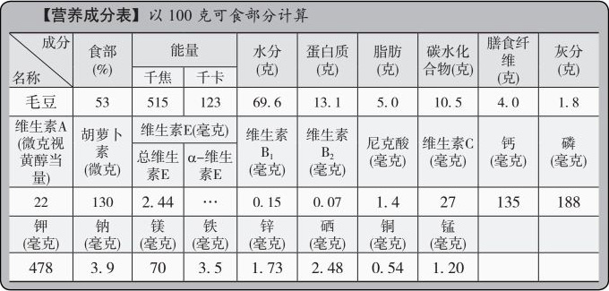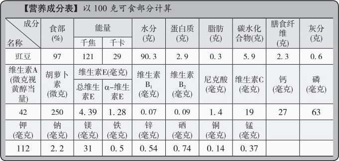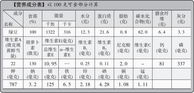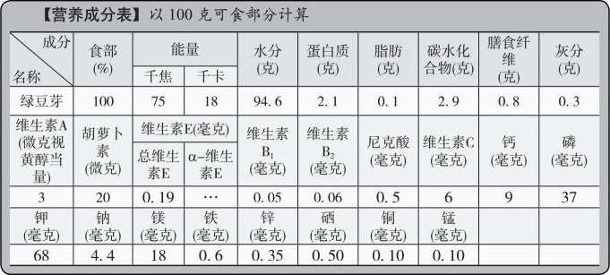 大豆与绿豆均可制作豆芽,豆芽除含有豆类的营养素之外,其显著特点是发芽后可产生抗坏血酸,一般含量为17~25mg/100g,绿豆芽可高达30mg/100g。尽管豆芽在烹调时会损失60%~70%的抗坏血酸,但北方地区冬季新鲜蔬菜缺乏,豆芽是一种较好的抗坏血酸食物来源。