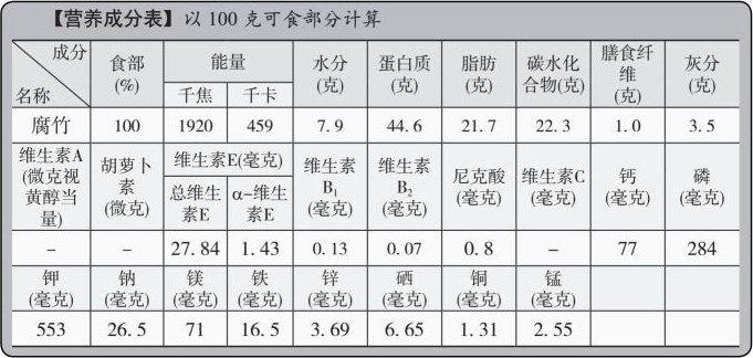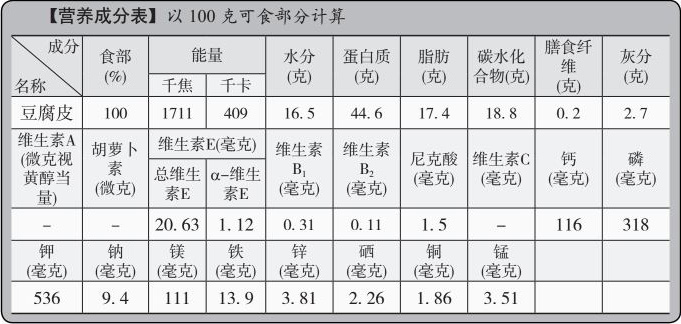 豆腐皮的分量虽然少,但营养却颇高,如果与蛋氨酸含量相当的蛋类一起食用时,即使是少量,也可成为营养效率颇高的料理。因此患有肝脏病害,而需要补充高营养食物的人们而言,是可多加利用的食物。