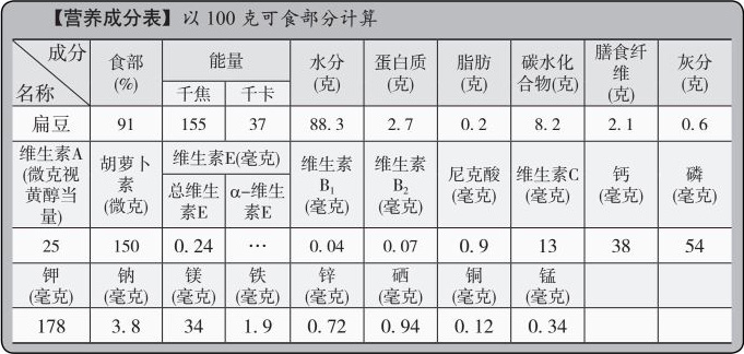 扁豆性平味甘,又称白扁豆、茶豆、南豆、藤豆、小刀豆、鹊豆和蛾眉豆等。其嫩荚、种粒可食,亦蔬亦粮,亦可入药。扁豆的嫩荚又叫嫩扁豆,以色鲜,嫩脆为佳;种粒以粒大、匀称、皮薄、灰分少为佳。