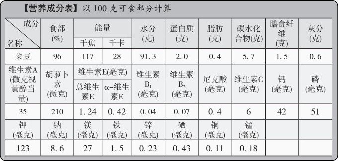 菜豆中的糖含量较多,并含有相当多的蛋白质,而钙质的含量也颇丰富。钙可促进蛋白质的吸收。同时也含有能促进糖质代谢的维生素B 1 及少量的对皮肤病或过敏性反应有效果的维生素B 6 ,因此,菜豆足以作为日常生活的主食。