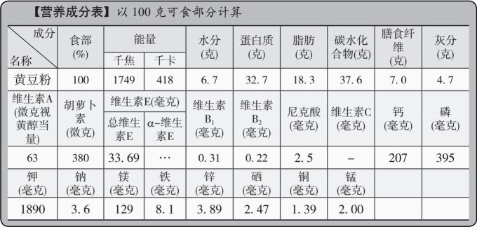 黄豆粉中富含蛋白质、纤维、铁质、钙质、维生素B 1 、B 2 等容易缺乏的营养成分。
