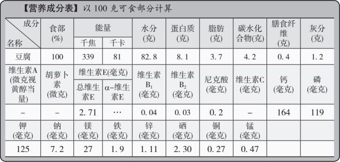 豆腐因种类不同,在成分方面即有所不同,因而有其不同的用途。木棉豆腐是使用加坠过滤而成,因此蛋白质、钙质、铁质的含量较多。换言之,适合煎炒,而用以代替肉类。绢滤豆腐由于不经过滤,因此水溶性的钾及维生素B 1 的含量较多,适合于作为凉拌或烫豆腐。充填豆腐是在包装盒内装满,加入凝固剂之后,经加热而使其凝固,因此保存性较高,维生素B 1 的含量也 接近木棉豆腐的二倍之多。