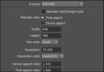 (1)Presets (预设):选择一个电影或视频格式的工业标准解像度。当你从预设的下拉菜单中选择了一个选项,软件自动设置Width(宽度)、Height(高度)、Device Aspect Ratio(屏幕高宽比)和 Pixel Aspect Ratio(像素高宽比)参数。