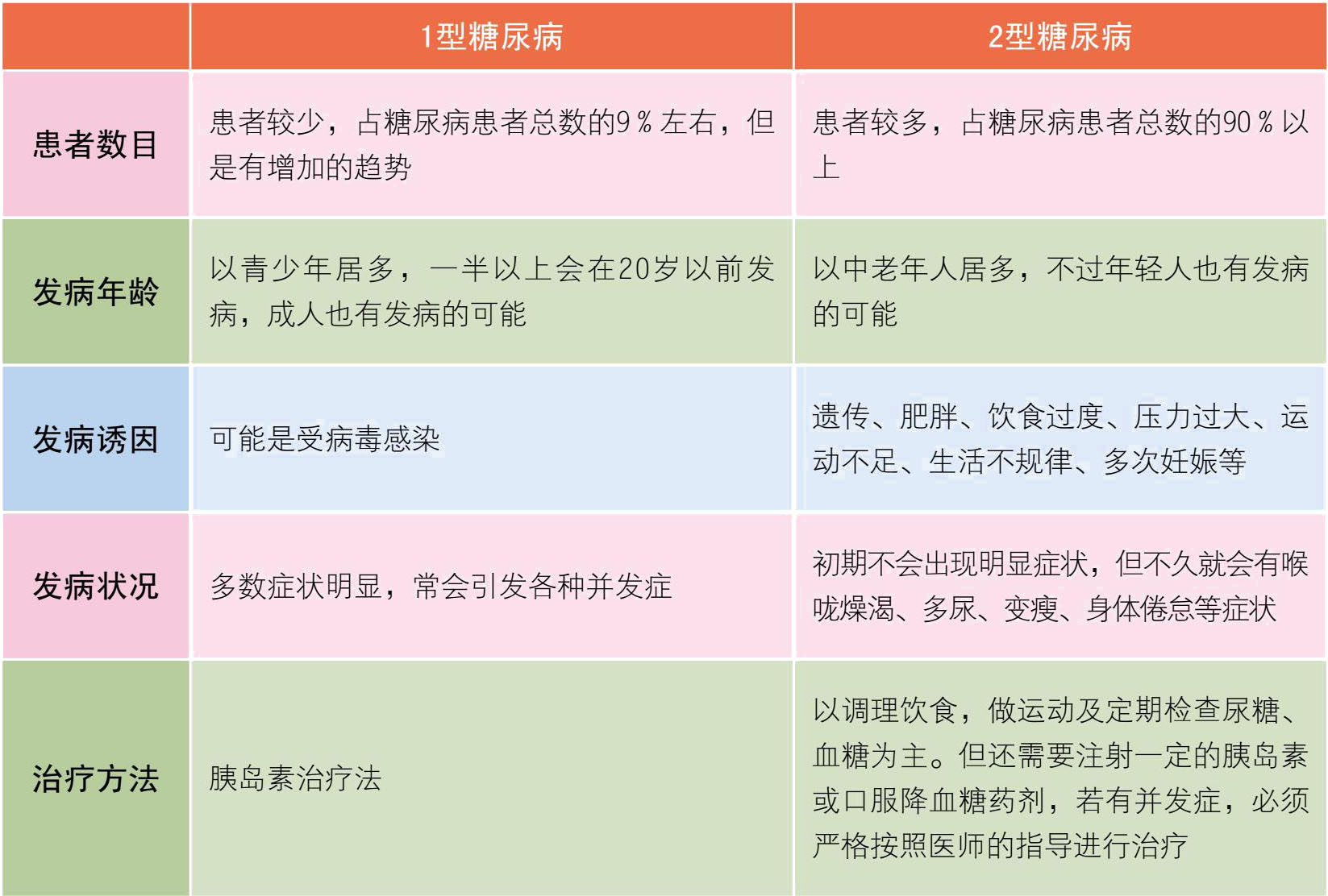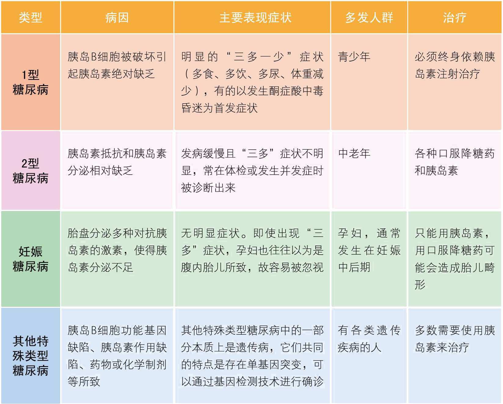 按照世界卫生组织(WHO)专家组的建议,糖尿病可分为1型、2型、其他特殊类型及妊娠糖尿病四种类型。其中,1型和2型糖尿病是糖尿病的主要类型,2型糖尿病患者更是占糖尿病患者总数的90%或更高。