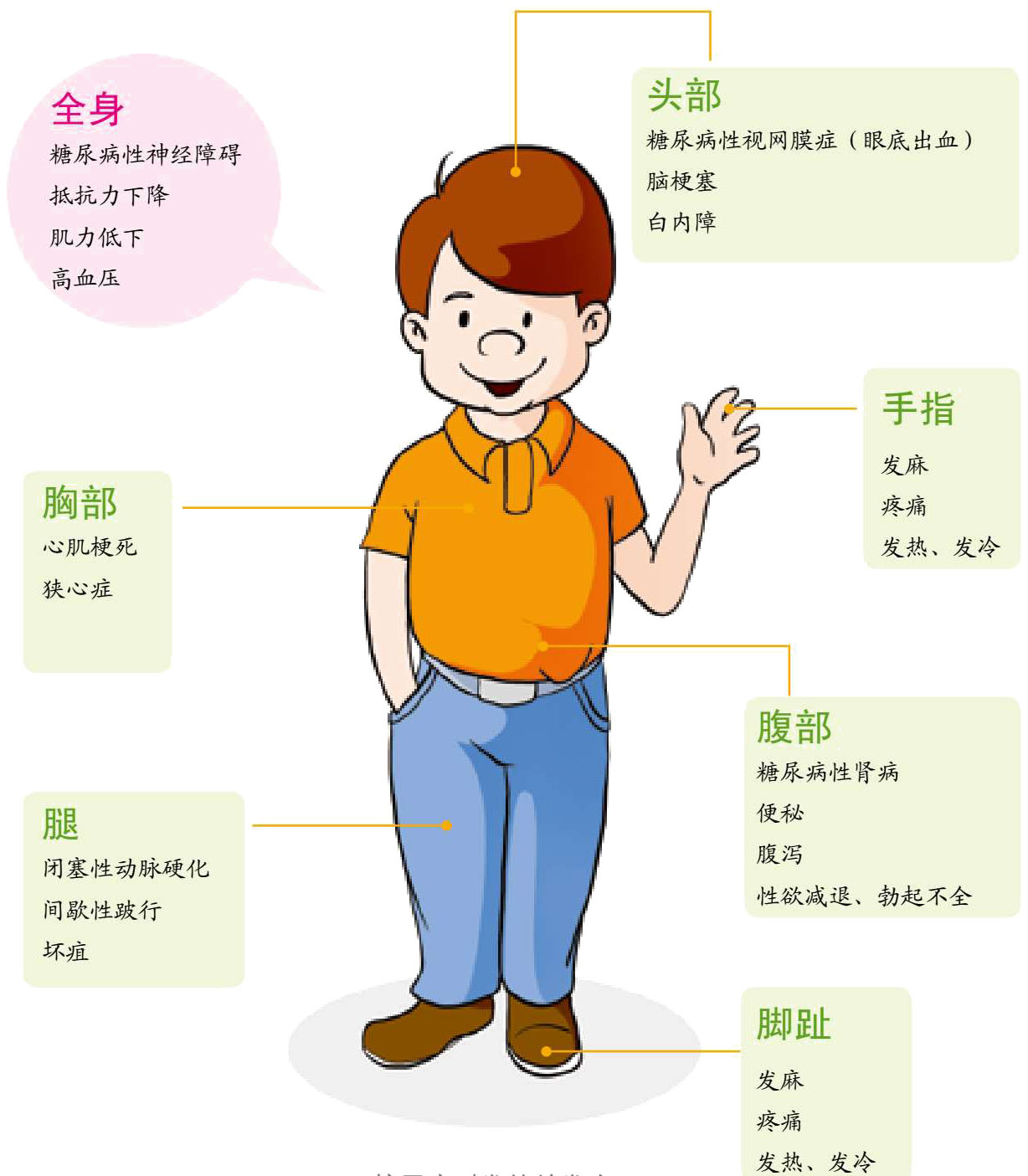 糖尿病会引发全身、头部、胸部、腹部、腿、手指、脚趾等部位的急慢性并发症。